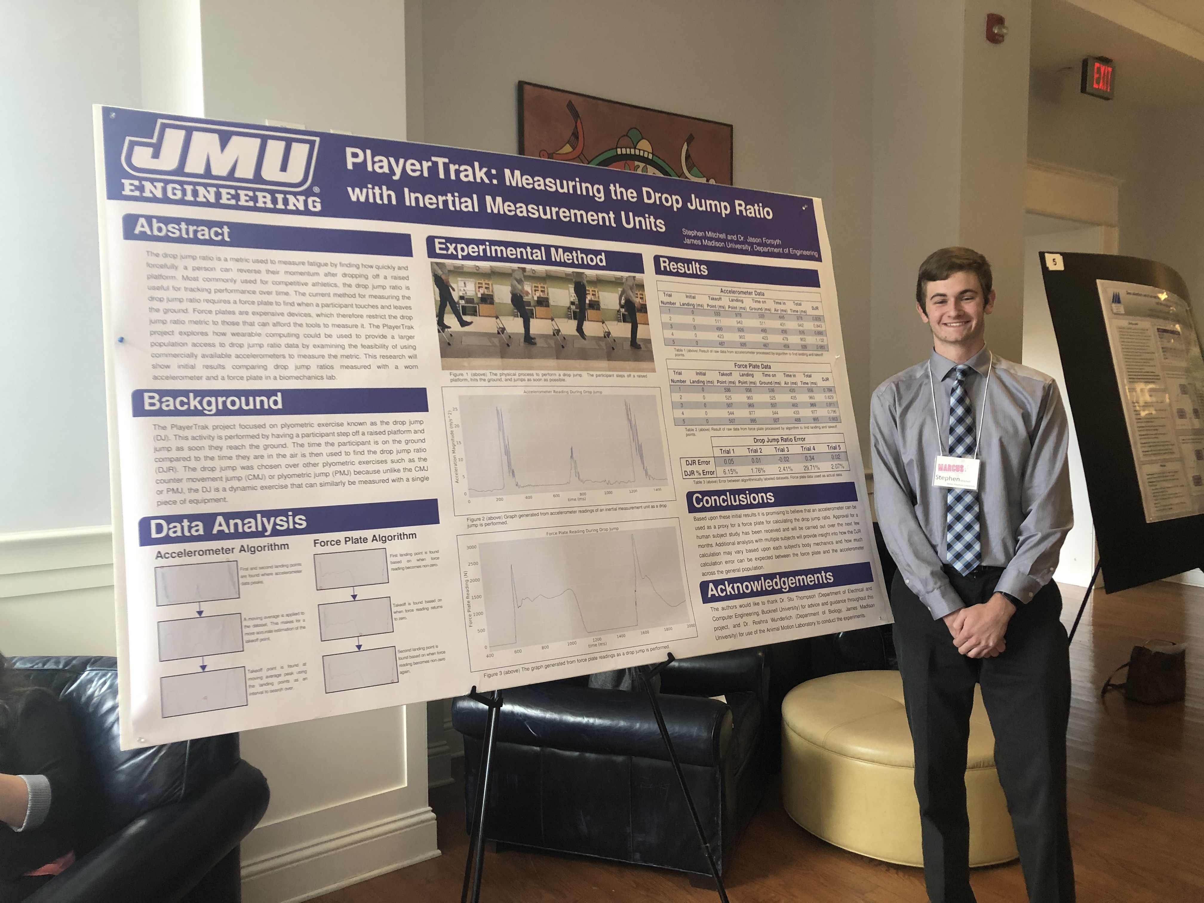 Sophomore JMU Engineering student and undergraduate researcher in the Wearable Computing Group, Stephen Mitchell, presented his initial research on measuring athlete performance at the 2019 Mid-Atlantic Regional Conference on Undergraduate Scholarship (MARCUS) at Randolph College. His work examines using low-cost inertial measurement units (IMU) to calculate an athletic performance measure called the “Drop Jump Ratio”. These IMUs are low-cost, light weight, and more mobile than traditional force plates used to calculate the drop jump ratio. More information can be found in his abstract and poster.