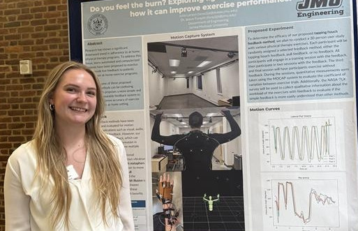 Julia Larson (Engineering ‘26) presented her research on haptic corrective feedback during exercise at the Virginia Academy of Science Annual Meeting at the University of Virginia. Her work examines whether feedback at the site of muscle activation is comparable or more effective than methods which target movement of the individual limb or joint. Her poster is available online (PDF).